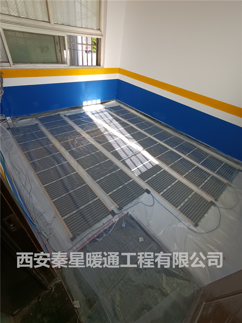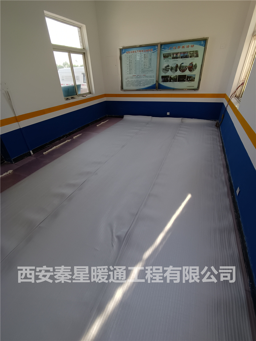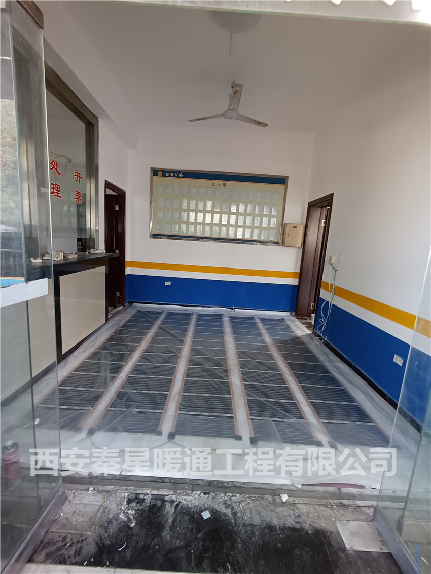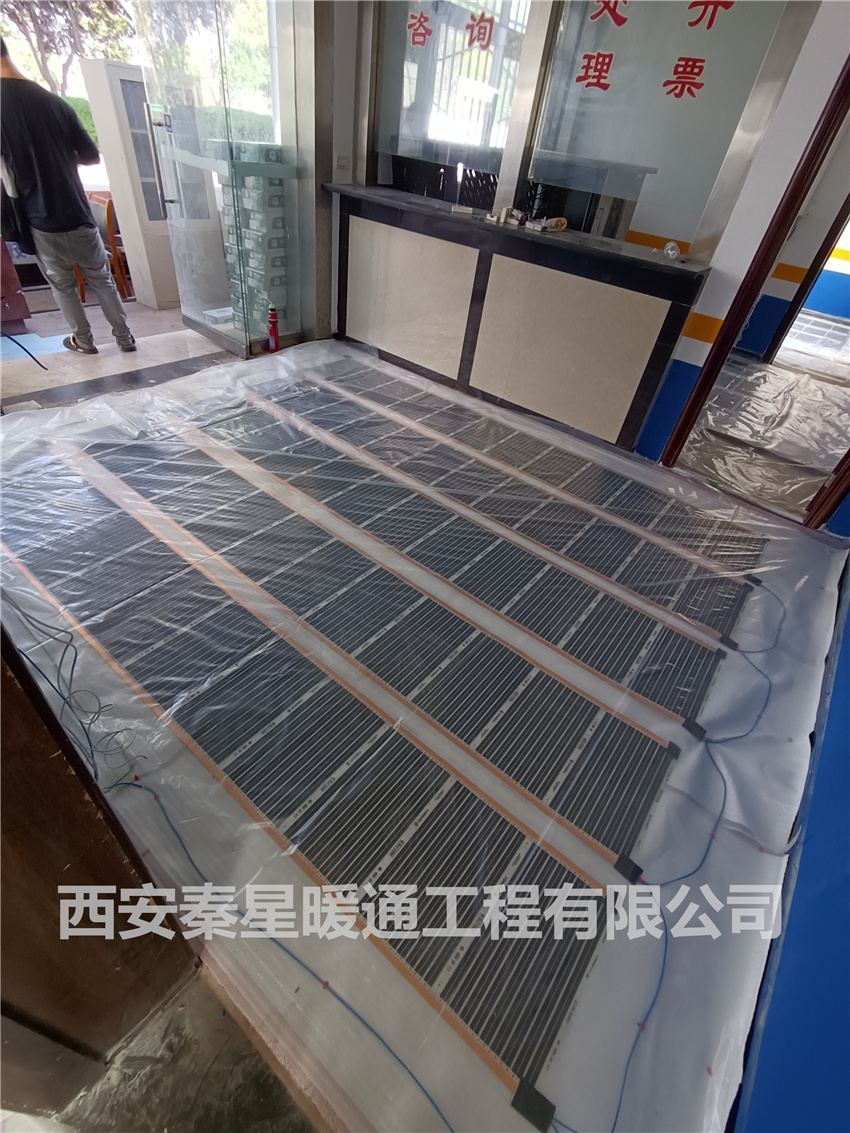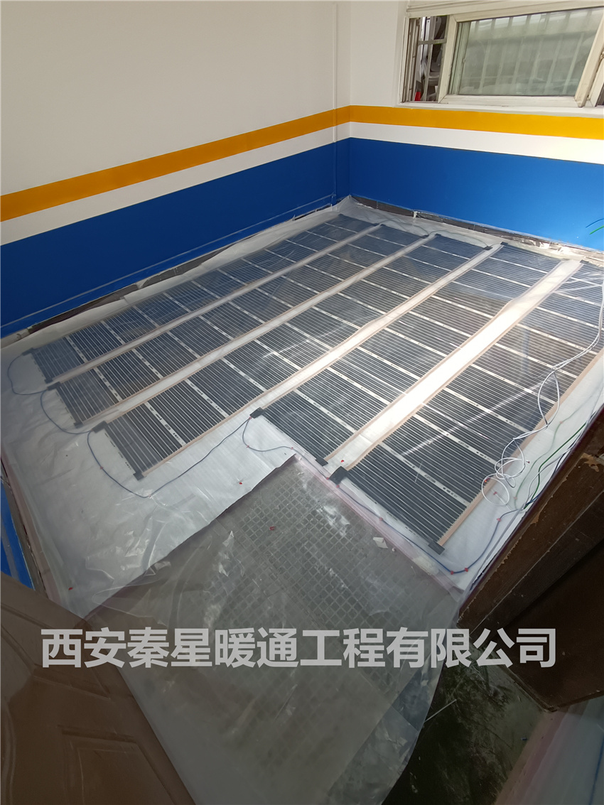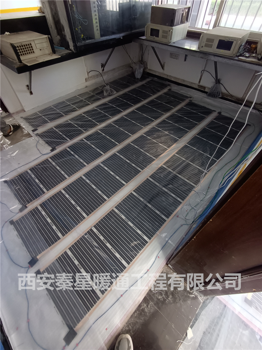 本工程為咸陽市永壽超速檢測站石墨烯電地暖安裝,采用石墨烯電熱膜進行鋪設,石墨烯電熱膜通電后將電能轉化為熱能,通過地面結構將熱量輻射到人體及空間,形成低溫熱輻射采暖