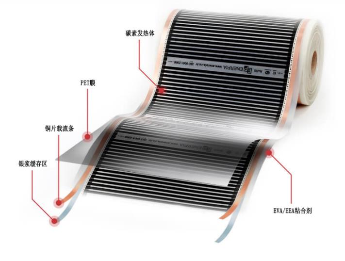 電熱膜是一種通電后能發熱的半透明聚酯薄膜,是由可導電的特質油墨、金屬載流條經加工、熱壓在絕緣聚酯薄膜間制成。通電后電熱膜中的碳、金屬分子、分子團之間的相互摩擦加劇而產生熱能,熱能通過遠紅外以平面方式均勻的輻射出來,以達到采暖的目的。